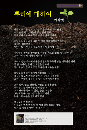 ‘뿌리에 대하여’ 감상평- 이삭빛을 사모하는 모임 이화정시인 독자(몽골 문학탐방) ‘우리는 꽃을 사랑하지만, 꽃을 키운 건 뿌리다.’ — 카를 빌헬름 슈나이더이삭빛 시인의 '뿌리에 대하여'는 단순한 자연 시가 아니다. 그것은 보이지 않는 자리에서 삶을 일으킨 존재에 대한 찬사이자, 조용한 사랑의 설계도다.가장 낮은 곳에서 가장 높은 생을 밀어올린 그 사람, 우리는 그 이름을 어머니라 부른다.