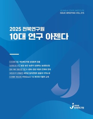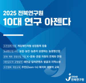 -전북연구원, 전북특별자치도 백년대계 설계 연구 아젠다 발표-5대 도정 목표의 구체화 및 정책 선도 위한 연구과제 선정[투데이안] 전북자치도 백년대계를 설계하는 씽크탱크 전북연구원(원장 이남호)이 민선 8기 비전과 목표 달성을 뒷받침할 2025년 10대 연구 아젠다를 선정했다.전북연구원은 12일 이슈브리핑(315호)을 통해 ‘함께 혁신, 함께 성공, 새로운 전북’의 비전과 ▲도민경제 부흥 ▲농생명산업 수도 ▲문화·체육·관광거점 조성 ▲새만금도약·균형발전 ▲도민행복·희망교육 등 도정 5대 목표를 뒷받침하기 위해 연구원 역량을 집중하기
