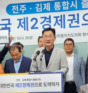 -“제2 경제권 도약 위해 전주김제 통합 시급…7대 상생사업 제시”[투데이안] 전주와 김제의 행정 통합을 추진하는 전주김제시민연합이 29일 전북특별자치도의회 브리핑룸에서 기자회견을 갖고 “전북이 인구 감소와 산업 공동화, 청년층 유출이라는 복합 위기를 극복하고 대한민국 제2의 경제권으로 도약하기 위해서는 전주김제 통합이 필수적”이라고 목소리를 높였다.행사를 주관한 전주김제시민연합(대표 최석규 전북발전협회 회장)은 “통합은 행정구역 결합을 넘어 수도권 집중을 분산시키고 글로벌 경쟁력을 갖춘 도시로 성장하기 위한 핵심 전략”이라며 “김