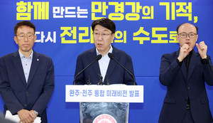 [투데이안] 우범기 전주시장은 30일 시청 4층 회의실에서 ‘완주-전주 통합시 비전 발표 기자회견’을 열고, 통합시 미래 발전 방향을 담은 ‘완주 전주 통합 미래비전’을 선포했다.이번 비전은 오는 2040년까지 통합시를 ▲100만 광역도시 ▲AI산업 기반 경제산업 중심도시 ▲가장 살기 좋은 직주락(職住樂) 정주도시로 만들겠다는 목표를 담고 있다.시는 약 8.8조 원을 투자해 ▲통합시 5대 메가 프로젝트 ▲정주 혁신 7대 프로젝트 ▲K-문화관광벨트 구축 ▲대한민국 최고의 첨단산업 허브 도약이라는 4대 전략, 총 23개 사업을 추진할