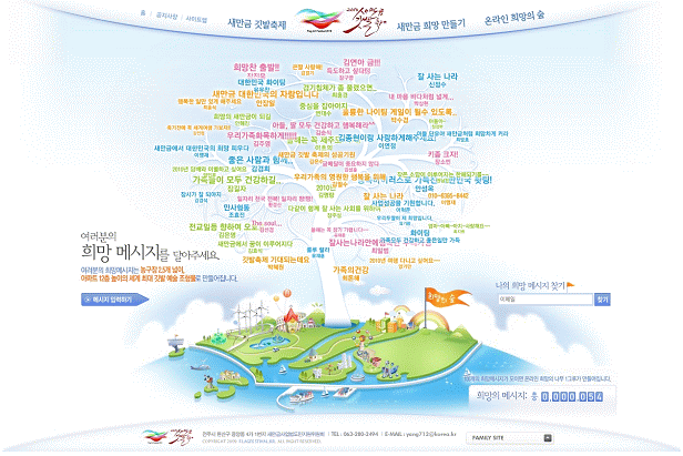 대한민국 녹색성장의 심장 새만금에 국민들의 희망을 모으는 희망 메시지 접수는 ‘2010 새만금 깃발축제’의 인터넷 홈페이지 공식 개통을 기념하는 이벤트의 하나로 진행되고 있다.