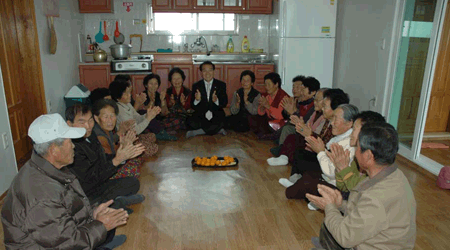 민선4기 공약사업으로 지역사회에 기반을 둔 공동생활을 통해 노인문제를 해결해서 21C 선진 노인복지 모델로 만들기 위해 독거노인을 위한 ‘그룹-홈’을 전국 최초로 추진하고 있습니다. 가장 현실적인 방안입니다. 어르신들의 편리한 생활을 위해 난방시설과 화장실에 목욕시설을 갖추도록 기존의 경로당을 리모델링 하거나 이러한 시설을 갖춘 경로당을 새로 지어 숙식을 함께 하면서 노래교실, 건강체조, 한글교실 등 각종 여가 프로그램을 시행하고 있습니다.