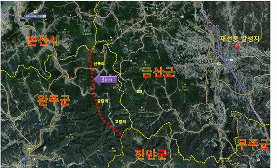 군에 따르면, 22일 충남 금산군 제원면 제원리 산1-11번지 소나무재선충병신규 발생으로, 소나무재선충병 차단을 위한 긴급히 지상 예찰을 실시한다.