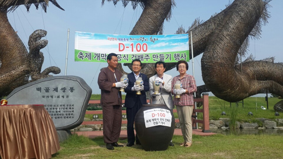 김제시(시장 이건식)는 대한민국 최초 4년 연속 대표축제인 제18회 김제지평선축제의 성공 기원 및 범국민적 관심과 참여를 확대하기 위해 D-100일을 앞둔 21일 주행사무대인 벽골제 쌍룡 특설무대에서 '축제 개막식 공식 건배주 만들기 행사'를 개최했다.