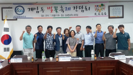 벚꽃축제 추진위원장과 3개마을(회시, 봉은, 유정) 이장, 행정(군, 면), 개암사 사무국장 등 이번 개암동 벚꽃축제를 성공적으로 이끈 주역들이 모두 모였다.
