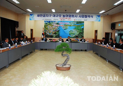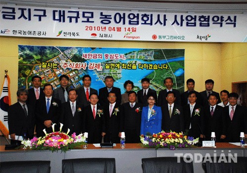 14일 김제시청에서 열린 새만금지구 대규모 농어업회사 사업협약 체결식에는 김완주 전라북도지사, 이건식 김제시장, 한국농어촌공사 한상우 이사, 농산무역(유) 조기심 대표, (주)동부그린바이오 차동천 대표, (주)초록마을 이상훈 대표 등 50여명이 참석했다.