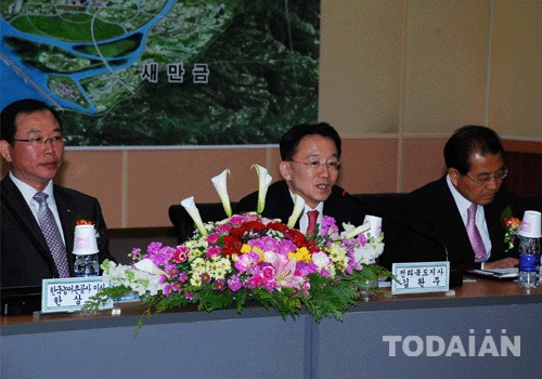 김지사는 특히 “새만금 사업은 1991년 방조제 공사를 착공해 20년이 지난 올 4월 27일에 드디어 방조제 준공식을 가질 예정”이라며 “지난 1월에 발표한 ‘새만금 내부개발 종합 실천계획’에 맞춰 본격적인 내부개발을 진행할 계획”이라고 강조했다./엄범희 기자