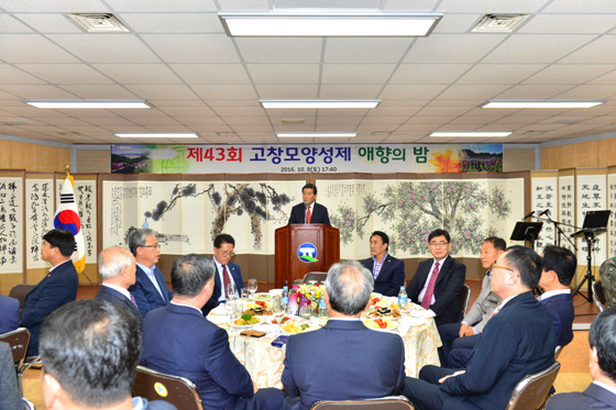8일 오후 고창군청 회의실에서 열린 ‘애향의 밤’ 행사에는 박우정 고창군수, 최인규 군의장, 고창출신 백재현 국회의원, 장명식·이호근 도의원, 군의원, 임정호 재경군민회장, 이진수 재전군민회장, 김기동 재광군민회장, 조병채 애향운동본부장, 진남표 고창모양성보존회장을 비롯한 기관 사회단체장 등 300여명이 참석해 고창 발전을 위한 화합을 다짐했다.