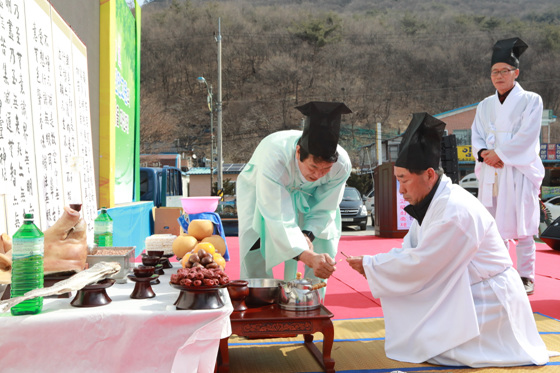 오전 10시 30분 주천사랑풍물회의 열림길 풍물놀이에 이어 축제의 성공 및 풍년을 기원하는 고로쇠 증산기원제가 열리고 있다.