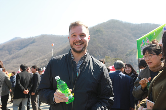 축제장을 찾아 미국에서 온 한 관광객이 고로쇠 수액을 맛보고 있는 모습.