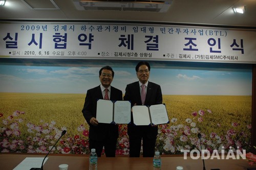 김제시는 효율적이고 쾌적한 하수처리를 위한 하수관거 BTL 2단계 사업 실시협약을 (주)태영건설을 주관사로하는 김제 SMC주식회사와 실시협약 조인식을 체결하고 2단계사업을 본격 추진한다고 밝혔다.