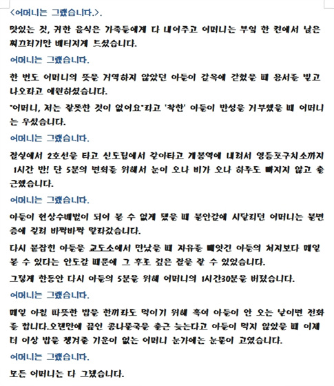 글 속에는 어머니에 대한 고마움이 소설처럼 감동적이다.