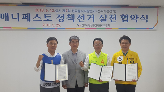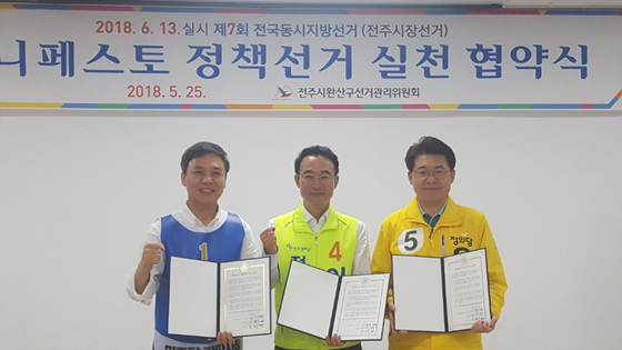 완산구 선관위에서 열린 이번 협약식에서 더불어 민주당 김승수 후보, 민주평화당 이현웅 후보, 정의당 오영수 후보 등 3명은 '매니페스토 정책선거 실천을 약속했다.