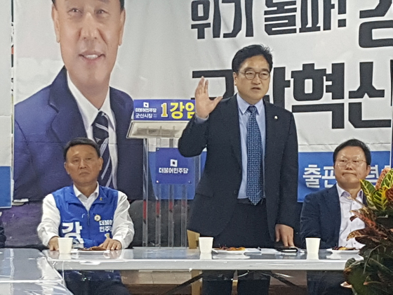 장인상 중인 송하진 더불어민주당 전북도지사 후보를 대신해 우원식 더불어민주당 공동선거대책위원장(전 원내대표)과 안호영 상임선거대책위원장이 군산과 부안, 고창, 정읍 등 4곳을 방문, 더불어민주당 후보들의 승리를 다짐했다.