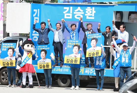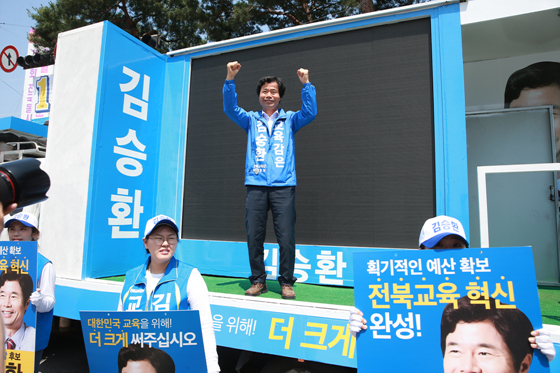31일 오전 순직교육자 추모탑 헌화로 6·13 지방선거 공식 선거운동을 시작한 김승환 교육감 후보가 이날 오후에는 대규모 유세활동으로 기선잡기에 나섰다.