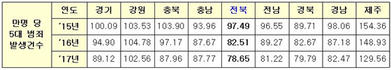특히, 범죄는 인구 만명당 5대 강력범죄(절도․살인․강도․폭력․강간) 발생률이 ‘15년부터 지속적으로 감소하면서 전국 최상위를 기록했다.