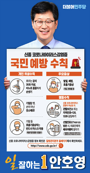 이와 관련, 안 예비후보는 주민들을 만나면서 악수 대신 따뜻한 눈인사를 나누고, 감염예방을 위해 악수 자제를 정중히 설명하고 있다. 또한 마을회관, 경로당 방문시 예방법 알려주는 등 바이러스 확산 방지에 동참하고 있다.