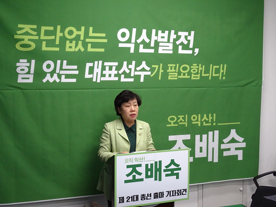 24일 조배숙 의원은 전북도의회에서 기자회견을 갖고 “오직 익산만을 생각하며 일편단심 익산발전의 한길을 달려왔다”며 “국가식품클러스터 등 제 손으로 시작했던 익산발전의 미래구상을 마무리 짓고 싶다”고 출마의 변을 밝혔다.