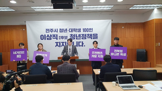 25일 전북도의회 브리핑룸을 찾은 청년·대학생들은 ‘우리의 입장’을 통해 이상직 후보가 제시한 청년정책과 공약사항에 대한 환영의 뜻과 함께 지지 의사를 밝혔다.
