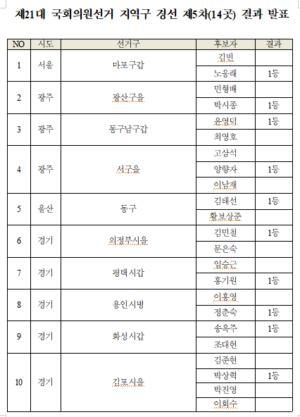 이로써 더불어민주당은 경선지역 6개 선거구와 단수공천지역 4개 선거구 등 모두 10개 선거구 본선진출 후보자를 확정했다.
