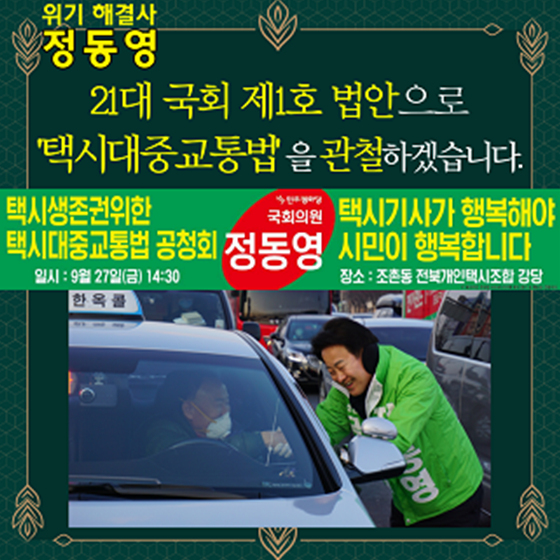 정동영 예비후보는 ”21대에는 1호 법안으로 발의해 반드시 관철해 낼 것“이라고 강조했다. 정동영 예비후보는 ”택시와 다른 대중교통 수단간 균형발전을 도모하고 국민 교통편의 증진에 보다 기여하기 위해 택시대중교통화가 필요하다“고 필요성을 설명했다.
