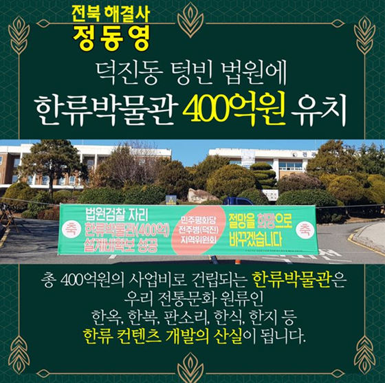 정 예비후보는 ”한류박물관 건립되면 법원 이전으로 몰락하는 상권을 되살리고 덕진동 일대가 전주 한류 문화산업의 중심으로 발돋움할 것“이라고 기대감을 내비쳤다.