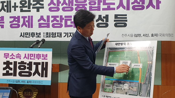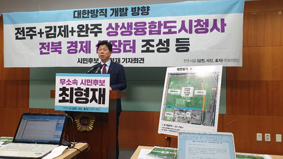 무소속 최형재 전주시을 국회의원 예비후보는 23일, 대한방지 부지 개발방안으로 ‘전주·김제·완주 상생융합도시청사’와 ‘전북 경제의 심장터’ 등 전주 광역화 발전전략 거점으로 조성하는 방안을 제시했다.