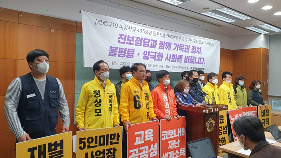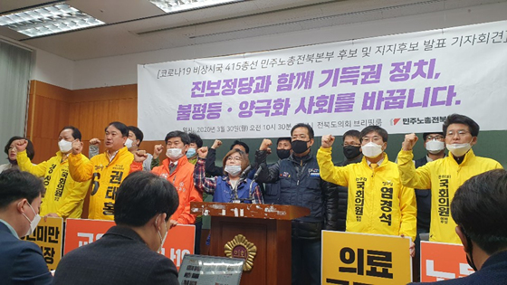민노총 전북본부는 "4만5000명 조합원과 함께 민주노총 총선 후보 및 지지후보와 함께 불평등과 양극화 사회를 바꿔낼 것" 이라며 "연동형비례대표제의 취지를 훼손하고 꼼수정당, 위생정당으로 민주주의를 후퇴시킨 보수 양당을 심판하고 전보정치 실현을 위해 진보정당과 함께 총선에 총력을 다하겠다"고 목청을 높였다.