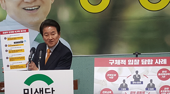 정동영 민생당 전주병 국회의원 후보는 9일 전북도의회 브리핑룸에게 기자회견을 갖고 “김성주 후보가 대주주로 있는 한 컴퓨터 회사가 관공서 입찰을 따내기 위해 여러 컴퓨터 회사와 사전에 공모한 것으로 추정되는 사례가 드러났다“ 며 "입찰담합은 자본주의 시장질서를 무너뜨리는 근본 범죄행위로 검찰의 신속한 수사를 촉구한다"고 주장했다.