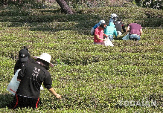 전남 구례에 있는 필자의 차밭 - 전주기전대학생 차 수확실습장면
