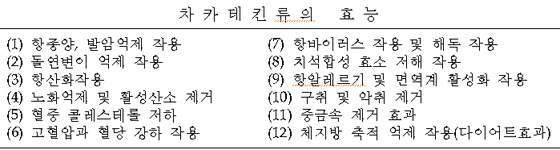 그러므로 많은 과학자들은 카테킨의 기능성에 주목하였고 그 효능은 매우 커서 현재 가장 활발히 연구되고 있는 분야이다。카테킨류의 효능은 대략적으로 아래 표와 같다.