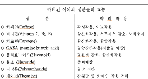 다음은 카데킨 이외의 기타성분으로 대단히 인체건강에 유용한 성분들이 함유되어 있는데 아래의 표와 같이 정리할 수 있다.