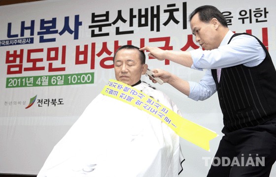 김완주 전북도지사가 한국토지주택공사(LH) 본사 분산배치의 염원과 의지를 삭발결행으로 분출했다.