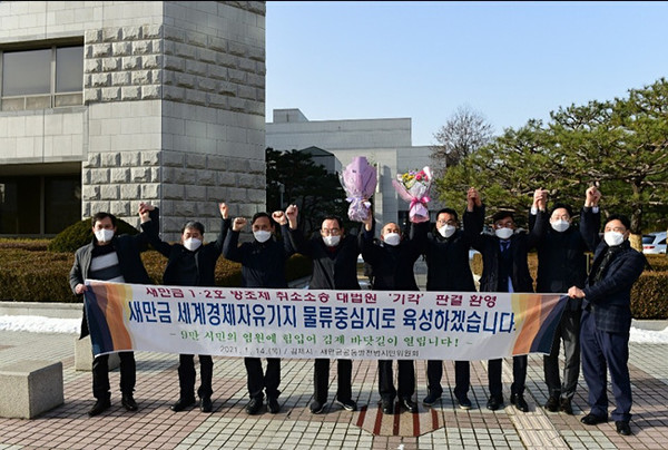 박준배 김제시장은 “대법원의 기각 선고 결정을 김제시민과 출향인들과 함께 환영하며 이번 사법부의 최종 판결에 따라 새만금이 반목과 대립이 아닌 상생과 희망의 지역으로 발전하길 기원하며 새만금이 동북아를 넘어서 세계경제 중심지로 발전해 지역의 미래성장 동력이 되기 위해 군산시, 부안군과의 상생의 협력과 중앙정부, 전라북도의 적극적인 지원 및 협조를 기대한다.”고 밝혔다.