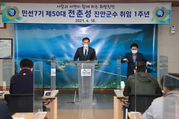 [투데이안] 지난 2020년 4월에 재보궐선거로 제50대 진안군수로 취임한 전춘성 진안군수가 4월16일로 취임 1주년을 맞아 정례 브리핑을 갖고 군민과 함께한 취임 1년간의 소회를 말하면서 남은 민선7기 임기동안 역점사업을 속도감 있게 추진해 군민 삶의 향상을 위해 혼신의 노력을 다하겠다고 밝혔다.