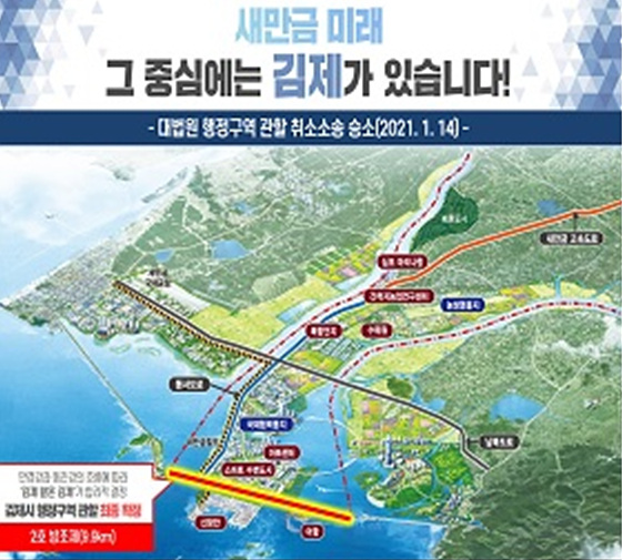 새만금 동서도로 개통으로 행정구역 결정의 중요기반이 마련된데 이어 지난 1월 대법원 취소소송 기각 판결로 새만금 2호 방조제 김제시 관할이 최종 결정된 바, 새만금 행정구역 논쟁에 종지부를 찍고 상생과 협력의 시대를 열어나갈 준비를 서두르고 있다.
