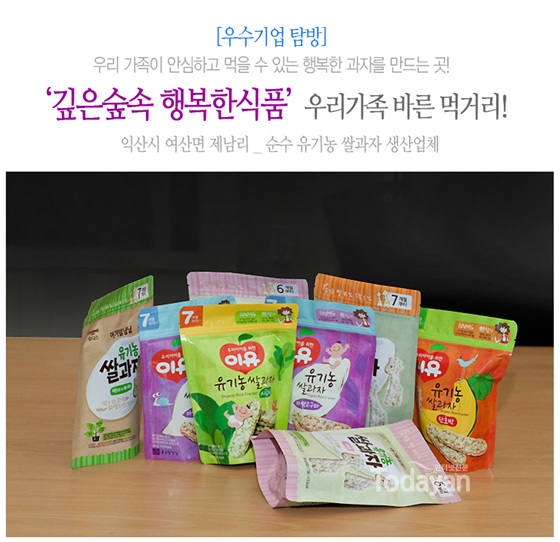 ‘깊은숲속 행복한식품’은 유기농 쌀과 익산의 농·특산품인 자색고구마 등 100% 국내산 자연재료를 사용해 다양한 유아용 쌀 과자 제품을 생산한다.