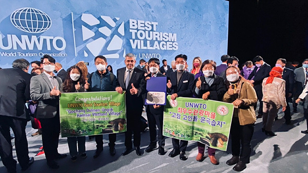 세계관광기구(UNWTO)가 2일 스페인의 수도 마드리드에서 총회를 열고 ‘대한민국 고창군 고인돌·운곡습지마을(이하 고창운곡마을)’을 최고의 관광마을(Best Tourism Village)로 선정했다. 현장에 함께한 이주철 고창군부군수와 이성수 생태환경과장, 조용호 운곡습지생태관광협의회장은 얼싸안고 기쁨을 나눴다.