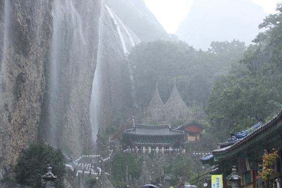 자연의 위대한 걸작품 암마이봉옆 역암층 위에 인간의 걸작품 탑사가 만들어지고 이곳으로 떨어지는 폭포수와 하늘로 오르고 있는 능소화를 보노라면 천하 비경이 따로 없다.