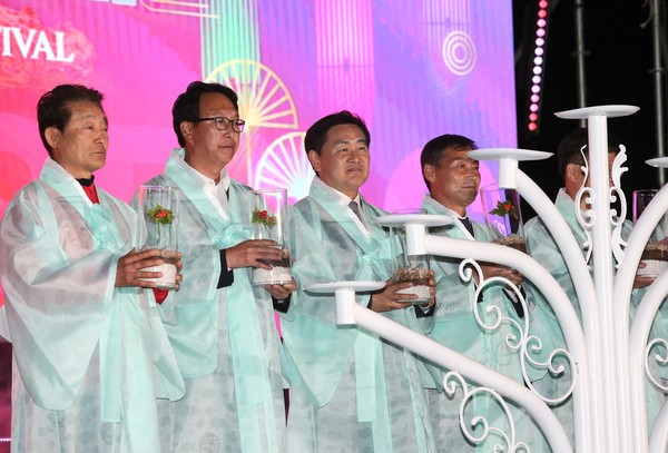 [투데이안] 8일 전북 진안군 마이산 북부 일원에서 열린 진안홍삼축제에 김관영 전북도지사와 서거석 전북도교육감, 안호영 국회의원, 최훈식 장수군수, 최영일 순창군수, 임정호 고창군의장, 전용태 전북도의원 등이 축제 퍼포먼스를 하고 있다.