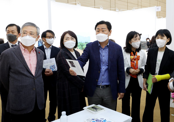 [투데이안] 9일 군산 새만금컨벤션센터에서 열린 군산 아트쇼 2022에 김관영 도지사와 목영숙 여사, 김동수 군산아트쇼 대회장, 이동근 군산아트쇼 조직위원장, 송은미 군산아트쇼 홍보위원장 등이 전시 작품들을 관람하고 있다.