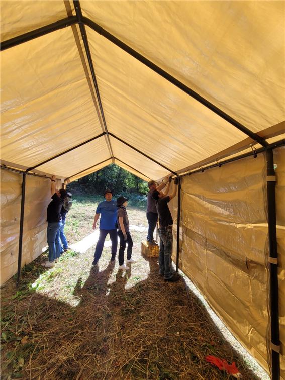 오늘의 봉사미션은 장애인자연영농체험학습장에 휴식공간인 대형천막을 설치하는 것이다.
