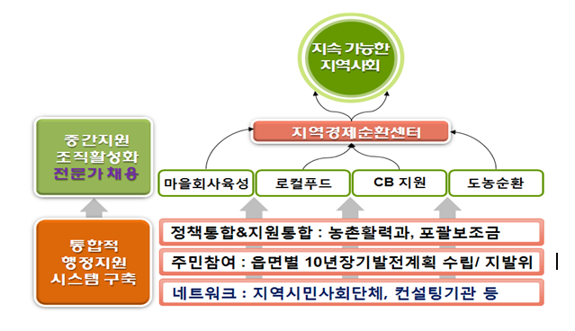 여러 실과로 분산돼 있던 마을사업 관련 행정조직을 정비해 지역경제순환센터와 거의 똑같은 직제의 농촌활력과를 신설해 종합적이고 일원적인 협력 및 지원체제를 구축한 것이다.