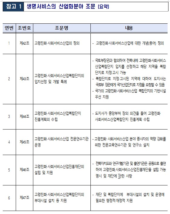 전북특별자치도 특별법의 생명서비스 산업화 특례는 ‘고령친화산업 시장 확대 및 국가차원의 미래성장동력 육성’을 위해 전북자치도 내에 고령친화·사회서비스산업복합단지 지정·고시를 가능하게 하고, 지역실정에 맞는 계획의 수립을 통해 전북자치도의 생명서비스산업 육성에 기여하고자 하는 것이다.