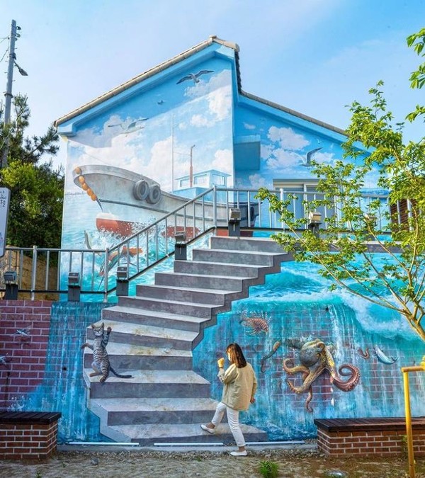 말랭이마을 곳곳의 벽화 사이에 숨겨진 사진 촬영 포인트를 찾아 재미있는 인생컷을 연출해보는 것은 어떨까?