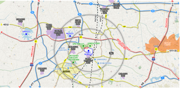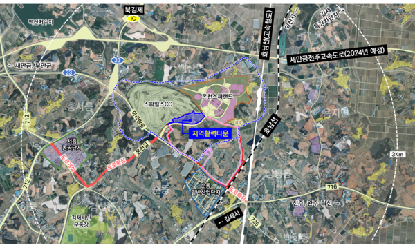 또, 김제시가지와 10분, 전주-완주혁신도시와 15분 거리이며 국도 23호선과 29호선, 호남고속도로 IC 9km이내, 김제역 5km 이내로 1일 KTX 4회 운영, 김제종합터미널 5km 이내, 새만금-전주간 고속도로는 1.2km 이내이며 2025년 개통 예정으로 사통팔달의 우수한 광역적 교통 여건을 갖췄다.