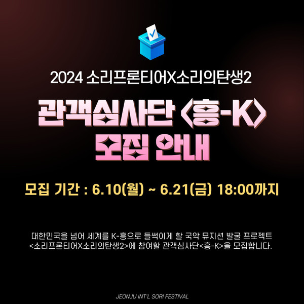 [투데이안] 2024 전주세계소리축제(조직위원장 이왕준, 이하 소리축제)가 대한민국을 넘어 세계를 K-흥으로 들썩이게 할 국악 뮤지션 발굴 프로젝트 <소리프론티어X소리의 탄생2>에 참여할 관객심사단‘흥-K(흔쾌히)’를 오는 21일 오후 6시까지 모집한다.