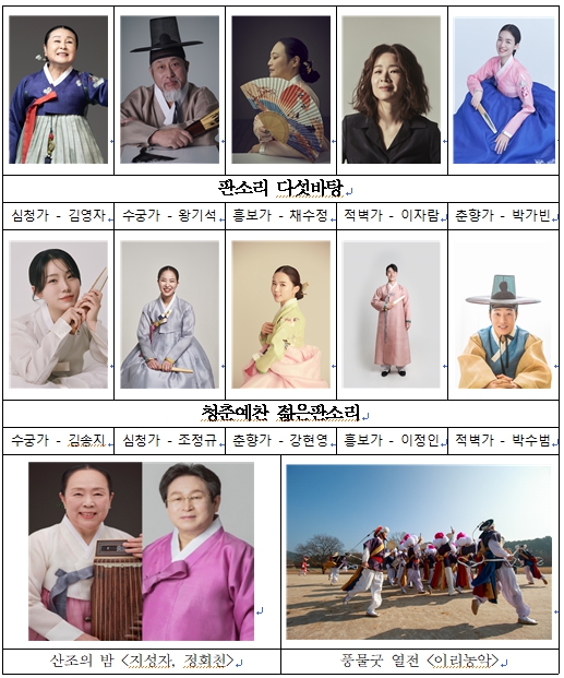 소리축제를 대표하는 브랜딩 공연 <판소리 다섯바탕>은 올해 국창부터 MZ 소리꾼까지 모든 세대가 다채롭게 즐길 수 있도록 올해의 국창, 시대의 명창, 라이징 스타 세 콘셉트로 나누어 판소리 공연을 기획했다.