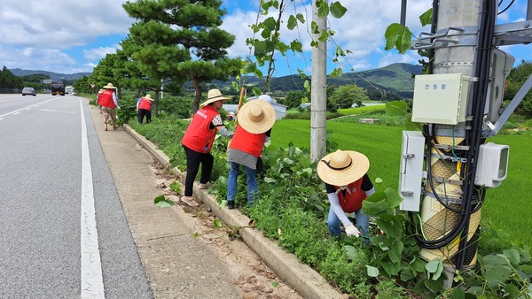 지난 7월 29일 고창군 무장면 한 도로변. 찌는듯한 무더위 속에서 밀짚모자를 쓴 무장면 안전협의체 소속 주민 20여명이 도로변 잡목제거에 한창이었다.