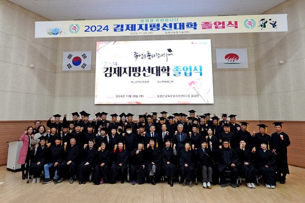 [투데이안] 김제시(시장 정성주)는 지난 28일 학장을 맡고 계신 정성주 김제시장과 김제시의회 서백현 의장, 전북도의회 나인권 의원과 졸업생 및 가족 등 80여명이 참석한 가운데 농업인교육문화지원센터에서 2024학년도 김제시지평선대학 졸업식을 개최했다고 밝혔다.